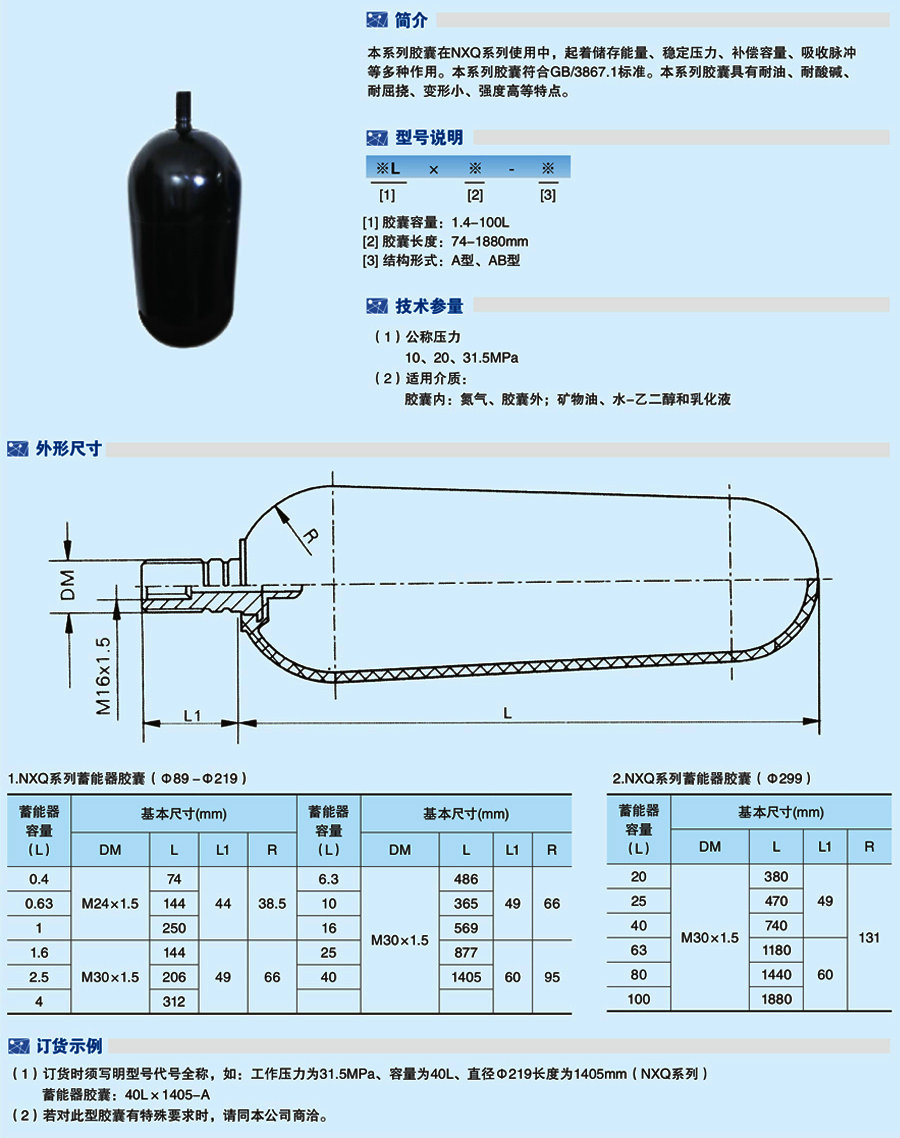1)訂貨(huo)時須寫明型號(hao)代號(hao)全稱(cheng)。如:工作壓力為31.5MPa,容量為40L,長度為1405mm的(de)(NXQ系(xi)列)蓄能(neng)器膠囊:40L×1405-A